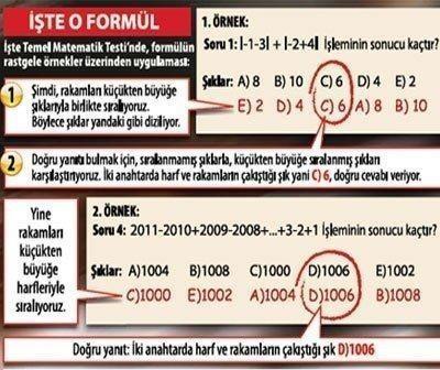 Formülle özellikle matematik testindeki soruların tamamına yakınını doğru çözmenin mümkün olduğu vurgulandı. Ayla Varan konuyla ilgili olarak şu görüşleri öne sürdü: “Yanıtları rakamsal olan sorularda şifreleme sisteminin hatasıza yakın uygulandığını gördüm. Sisteme göre yanıt şıklarındaki rakamlar küçükten büyüğe göre sıralanıyor. Eğer çakışan varsa doğru yanıt çakışan rakamın bulunduğu şık oluyor. Hiçbir rakam çakışmazsa doğru yanıt ‘E’ şıkkı olarak çıkıyor. Birden fazla çakışan varsa da yanıt en küçük rakamın bulunduğu şık oluyor. Matematik testindeki 40 sorudan bu sistemi uygulayarak 37 sorunun doğru cevabına ulaşılabiliyor. Ayrıca yanıtları rakamsal olarak verilen Sosyal Bilimler, Türkçe ve Fen sorularında da aynı formülü uygulayarak en az 50 soruyu daha rahatlıkla çözebilirsiniz.” Varan, ayrıca bazı Türkçe sorularında da alfabetik şifreleme olduğunu öne sürdü.